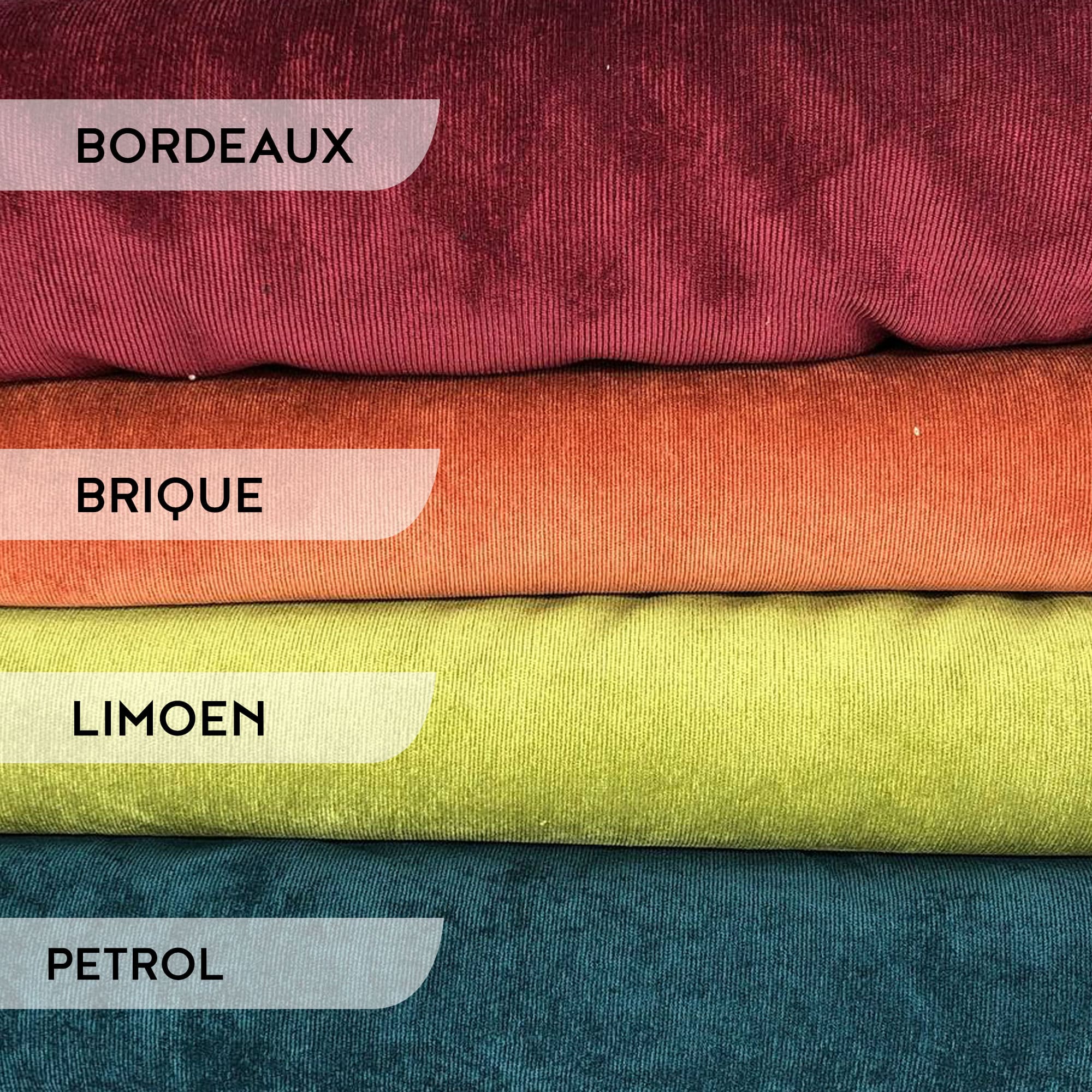 Tissu en velours côtelé doux et étroit à l’aspect velours. Lavable à 30 degrés. En plus du cordon Velvet, nous disposons également d’une large gamme d’autres tissus en velours côtelé.